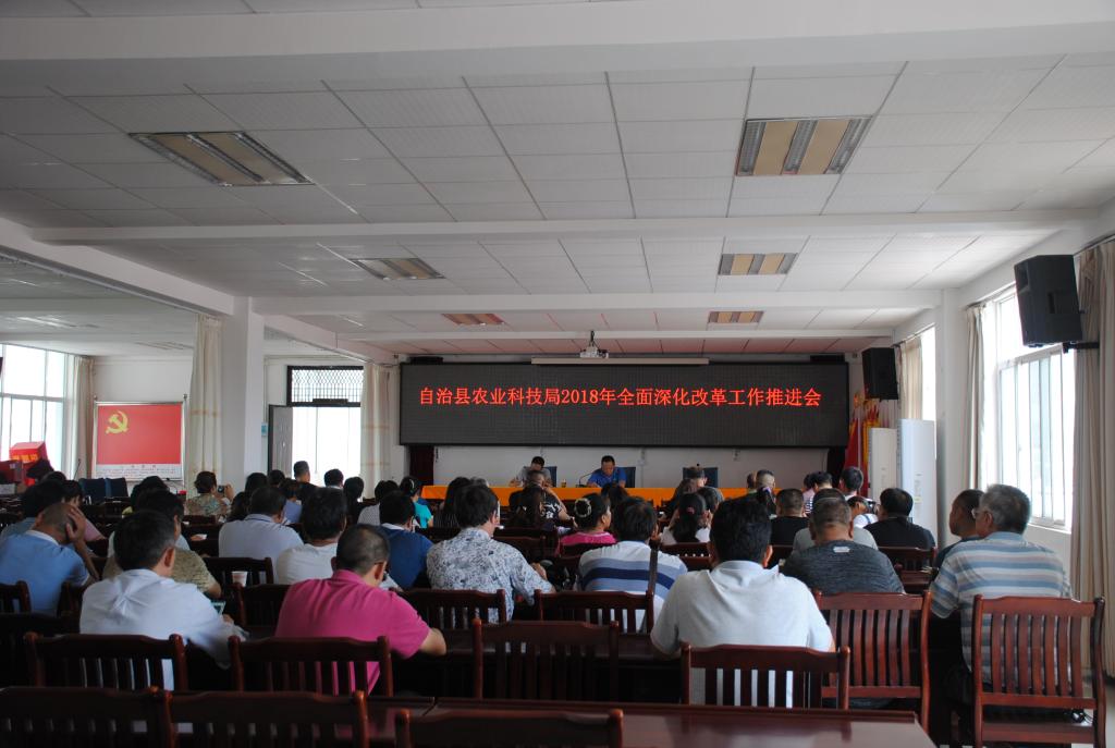 8月14日上午,自治县农业科技局召开2018年全面深化改革工作推进会。局党组成员、副局长李昌庭同志主持会议,局属单位负责人、局机关各股室负责人及部分工作人员参加了会议。