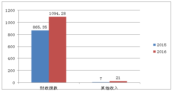 入的1.88%。财政拨款收入与上年度收入8,653,511.33元对比,增加2,289,298.68元,增加26.46%,主要原因为2016年人员经费增加,包括单位人员调入、调资、增资,交通补贴,绿色经济奖等,以及加大2015年和2016年项目执行力度;其他收入与上年度70,000元对比,增加140,000元,增加200%,主要原因是2016年国家局直接下拨项目调研经费(野生食用菌重金属含量水平与问题研究项目21万元)。